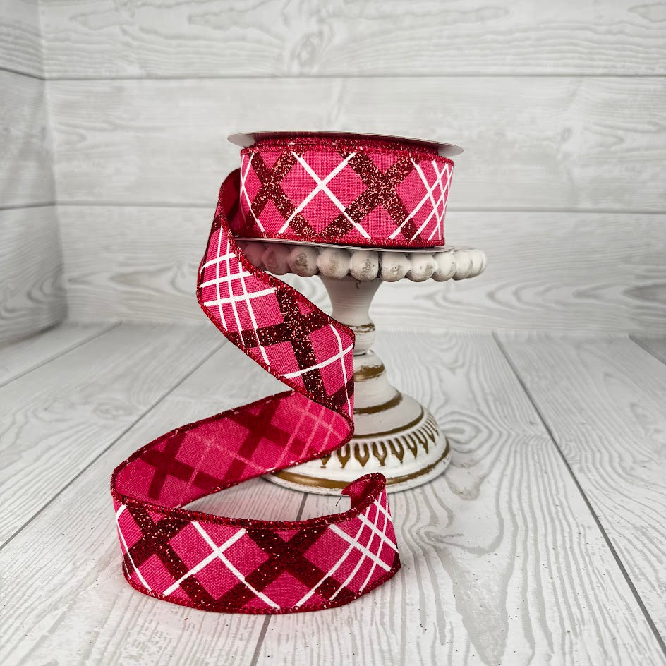 1.5"X10YD GLITTER DIAGONAL PLAID/ROYAL - PINK/WHITE/RED - RGA124711
